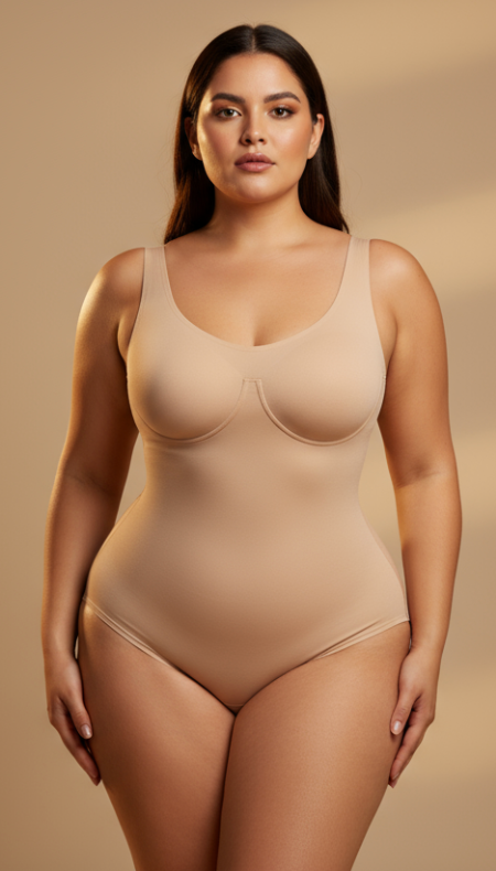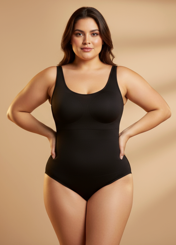 latina woman with natural curves wearing a seamless black shapewear bodysuit, elegant pose with arms raised, minimal beige background, soft warm light, smooth skin tone, premium fashion photography inspired by modern mexican brands, calm and confident energy, LUNÁRA branding style